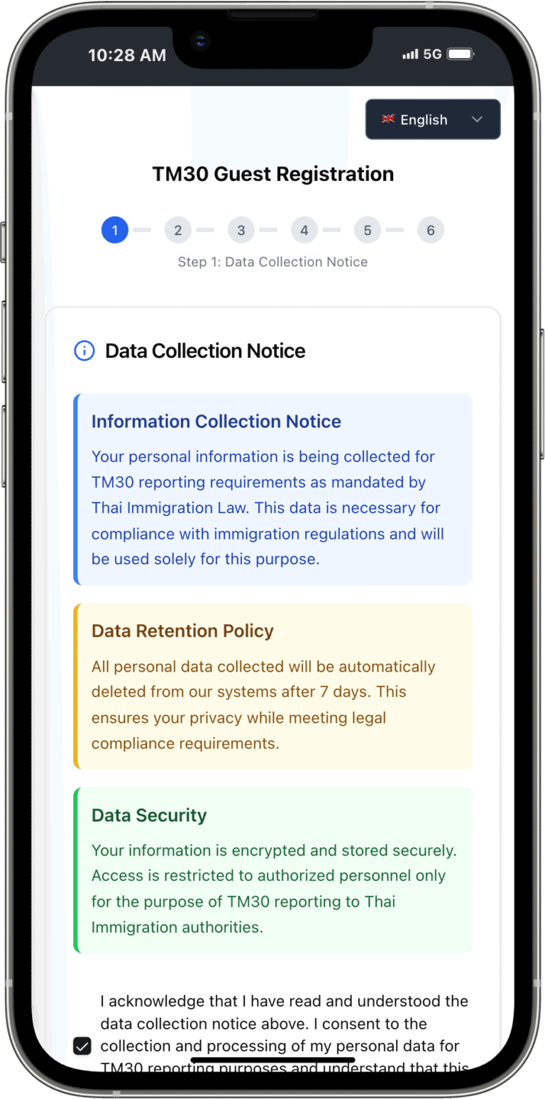 Guests submit passport details and personal information through a secure online form before arrival or at check-in. The system automatically generates complete TM30 reports in the correct format, helping you meet